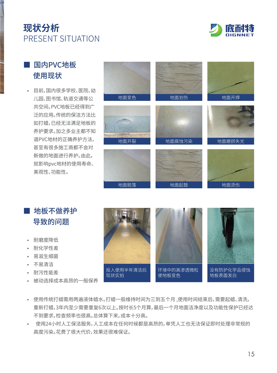 ●目前,国内很多学校、医院、幼儿园、图书馆、轨道交通等公共空间, PVC地板已经得到广泛的应用。传统的保洁方法比如打蜡,已经无法满足地板的养护要求。加之多业主都不知道PVC地材的正确养护方法,甚至有很多施工商都不会对新做的地面进行养护。由此,就影响pvc地材的使用寿命、美观性、功能性。