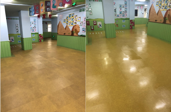 底耐特保养幼儿园PVC地板后,地面光亮崭新,更加耐脏污、耐磨损。